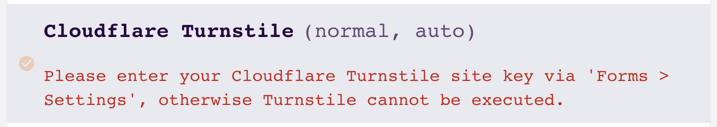 The Turnstile block in Greyd Forms integrates a Cloudflare Turnstile check into the frontend of your form to help prevent spam submissions. Before using the block, the Cloudflare Turnstile site key and secret key must be added under Forms → Settings. If no site key is defined, a warning message will appear in the editor indicating that the Turnstile cannot be executed. Once a valid site key is provided, a placeholder labeled “Turnstile banner” will appear in the editor to indicate the position of the Turnstile on the frontend.