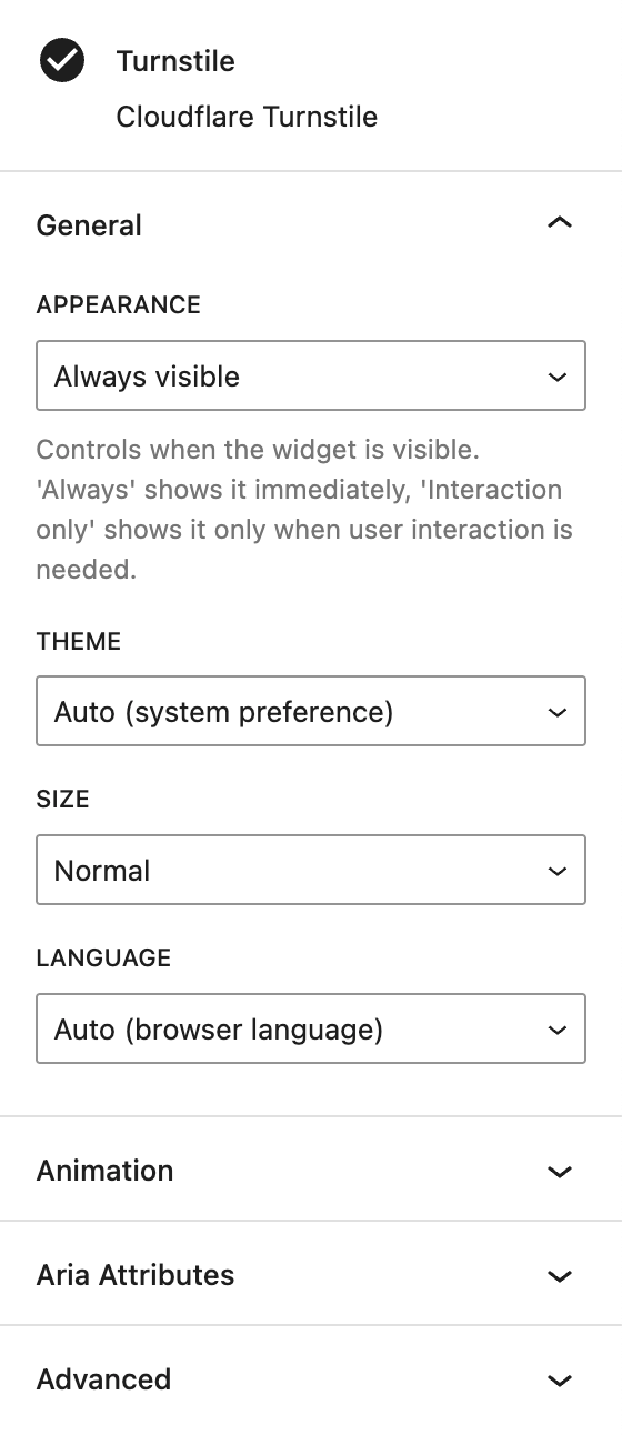 Under the General section, several options are available to customize the Turnstile banner.