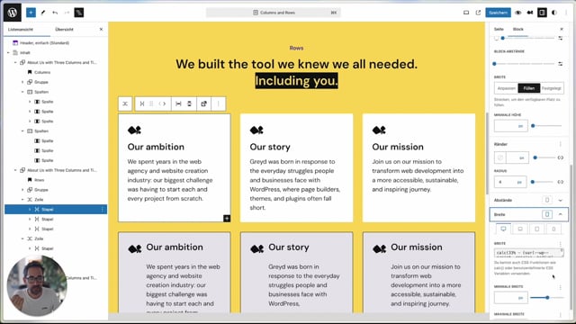 In this video, we will show you when to use columns, when to use rows and when to use the new Block Editor grid function to structure your website in the best possible way. We take a look at the different variants and discuss the respective advantages and disadvantages so that you can make the best decision for your web design. Whether you want to create simple layouts or complex, responsive designs – this video explains step by step how you can use these functions effectively!