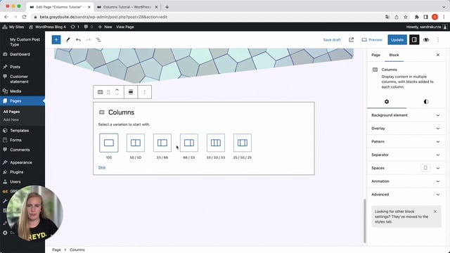 Hi, this is Sandra from GREYD and today I’d like to show you the abundant options that the columns block offers you in GREYD.SUITE. This is a block that saves you from a lot of design plugins, as all these designs here are possible out of the box. So columns give your website its structure. When you add a columns block, you can select a layout right away or if you skip that step, a two-columns-layout will automatically be created.